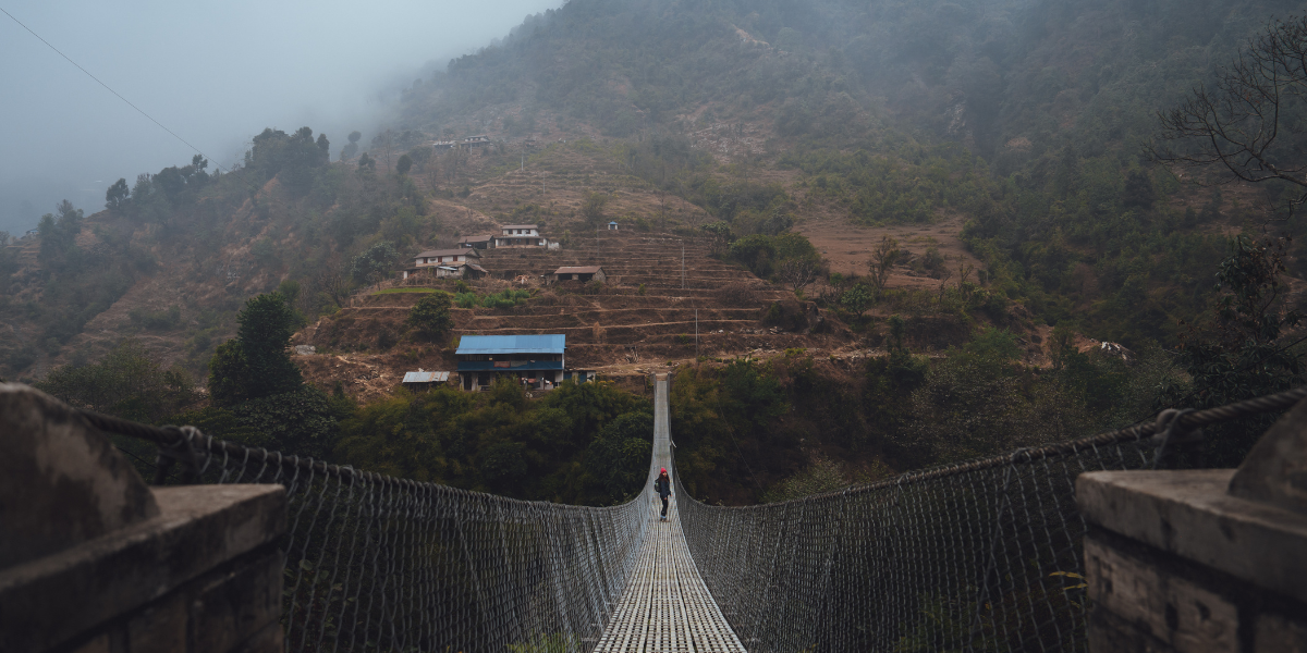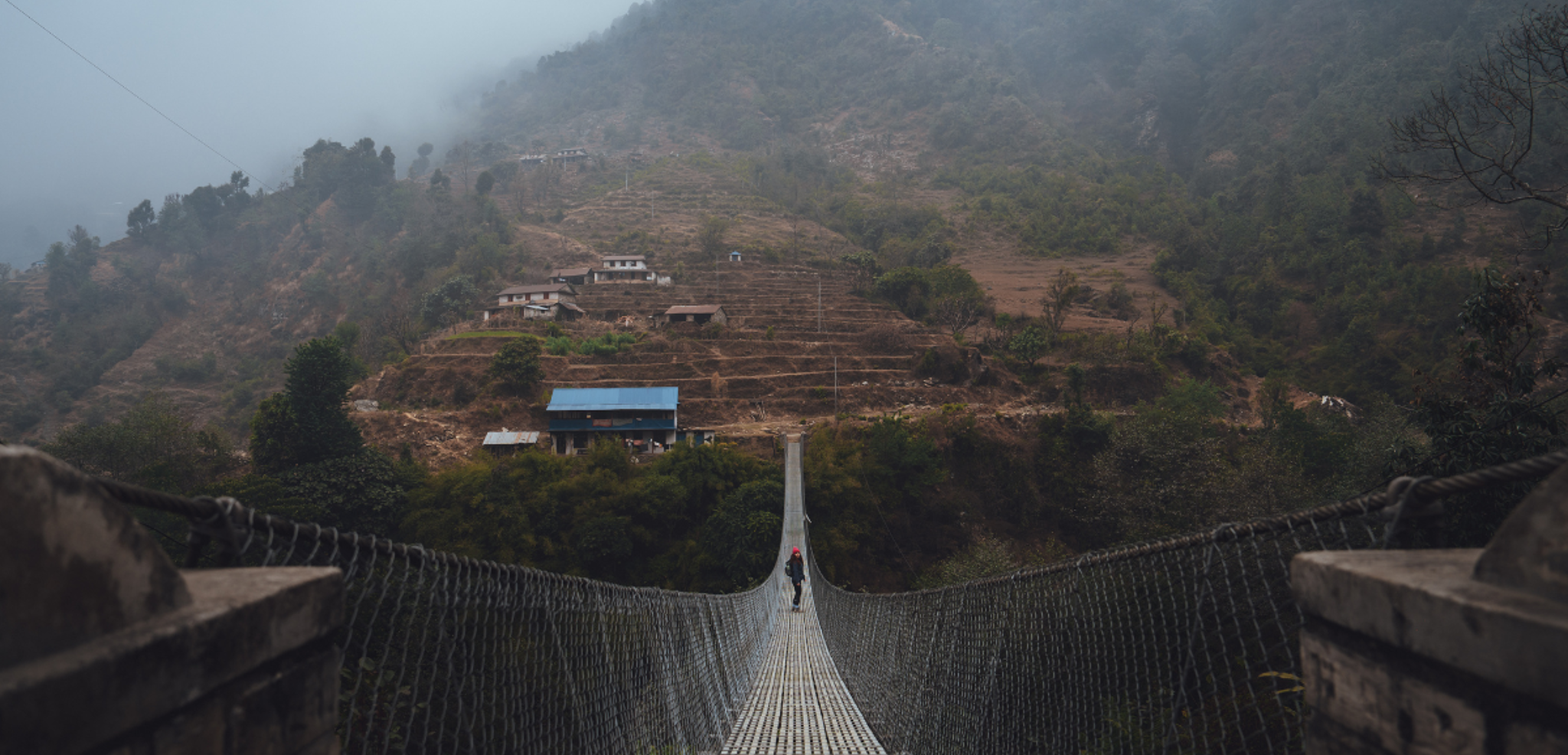 Vous empruntez un pont suspendu pour traverser la rivière puis vous remontez par une série d'escaliers en pierre à travers les rizières pour rejoindre Ghandruk.